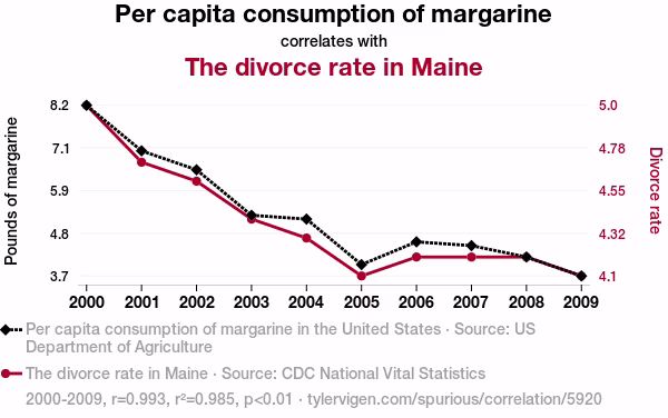 AI explanation: Perhaps as people used less margarine, they became less slippery in their relationships. The lack of artificial spread may have kept the couples from buttering each other up, leading to a decrease in overall marital strife. That's the reality when you can't believe it's not butter - it's a recipe for marital success. Alternatively, it could be that as the margarine consumption decreased, so did the overall slickness in the state, leading to fewer instances of partners feeling like they couldn't grip the marriage.